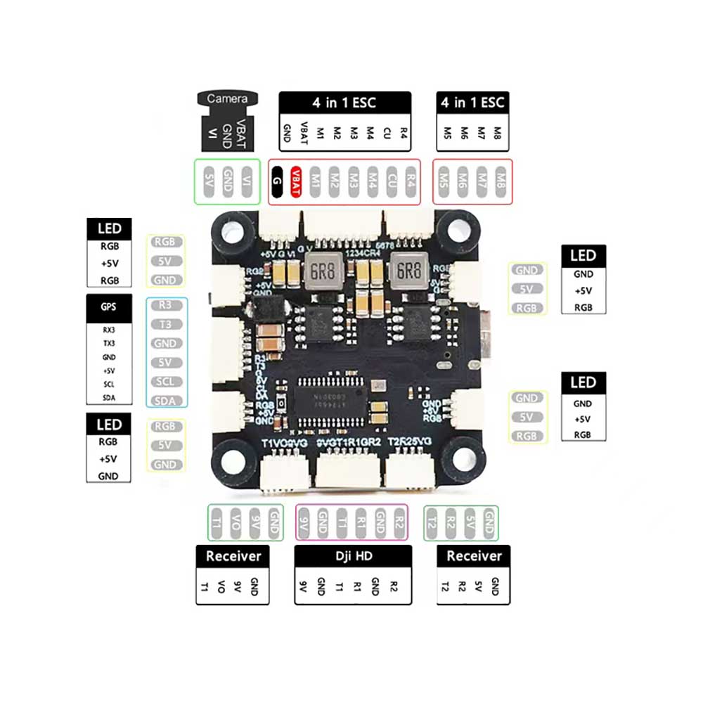 - MCU (Main Processor): the Flight Controller Stack including STM32F722RET6 (high-performance 216MHz processor)