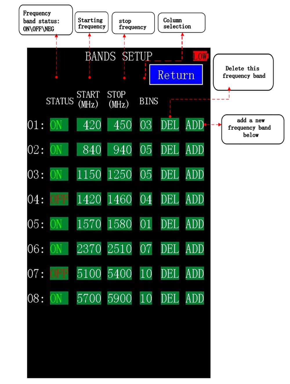 - Real‑time bar graph – green blocks show current signal strength per bin.