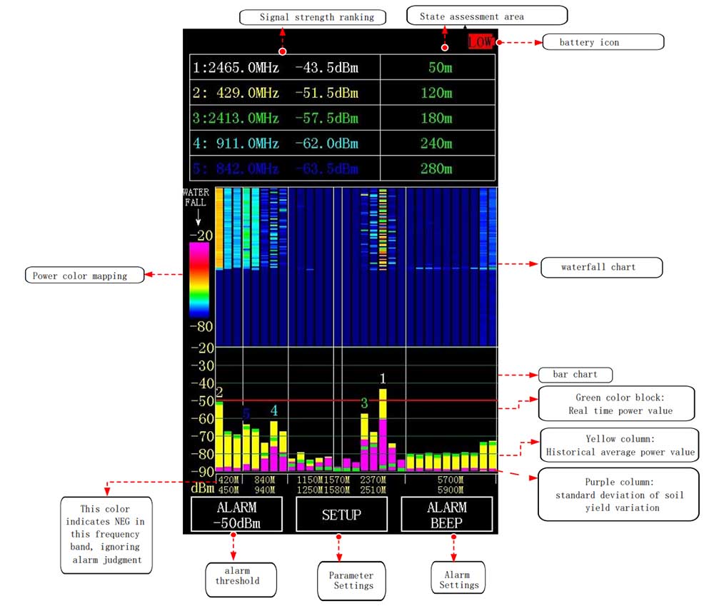 - Combines real‑time bar graph, waterfall plot, top‑5 signal sorting, and distance estimation on a single screen.