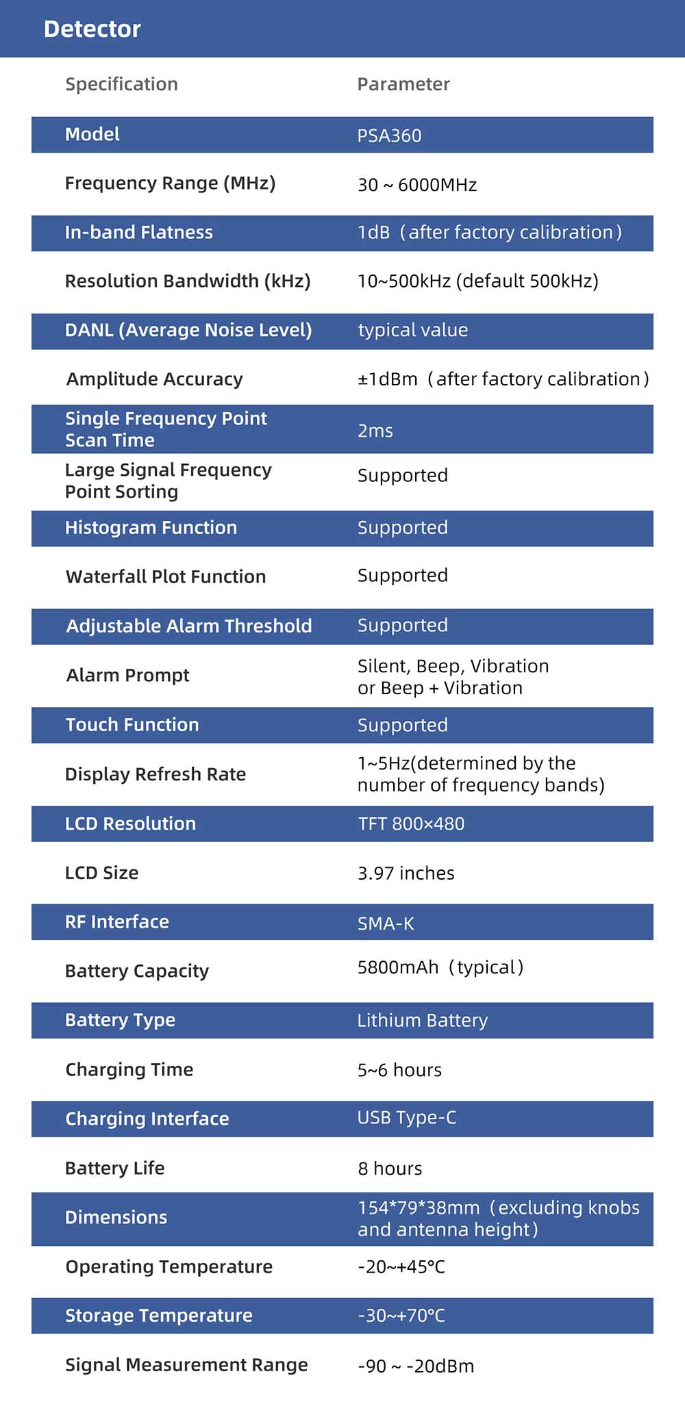 | Signal measurement range | -90 dBm to -20 dBm |